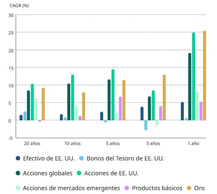 - Consistencia a largo plazo. A 20 años, el oro presenta una CAGR cercana al 10%, superando con claridad a la renta variable global, a los bonos y al efectivo en EE. UU.