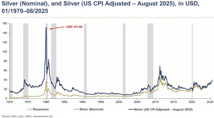 Con la plata física en ~$48, sigue muy lejos de su máximo histórico ajustado (≈ $151,68 en términos de hoy). Mirar solo el pico nominal de 1980 subestima su verdadero valor, porque $1 en 1980 compraba mucho más que $1 en 2025.
